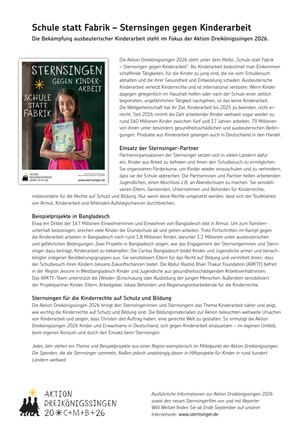 Erhebt eure Stimme! Sternsingen gegen Kinderarbeit Im Fokus der Aktion Dreikönigssingen 2026 steht der Kampf gegen Kinderarbeit. Hier die Termine für 2025 und 2026: